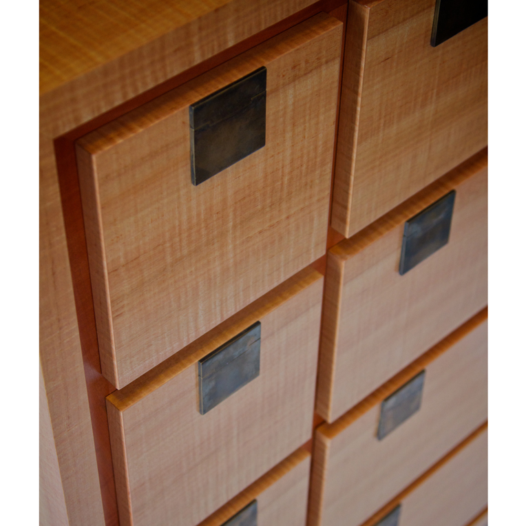 Matched drawer fronts are highlighted by a recessed Myrtle grid and handmade bronze flap handles.